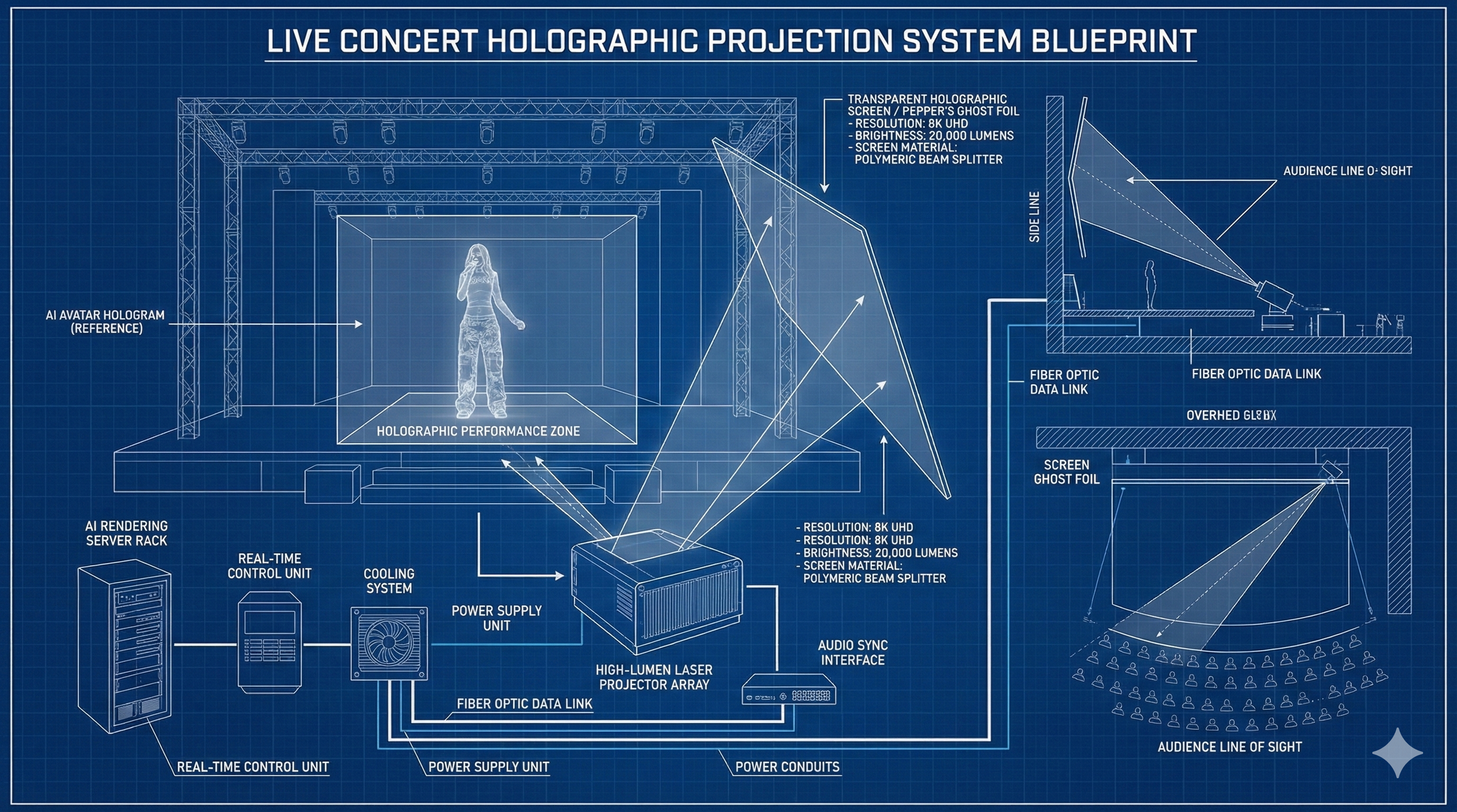 Hybrid music project blending human performance with an AI vocalist. It includes a full album, a live hologram show concept, an experimental 10,000-song release, and future development toward a physical robotic performer.
